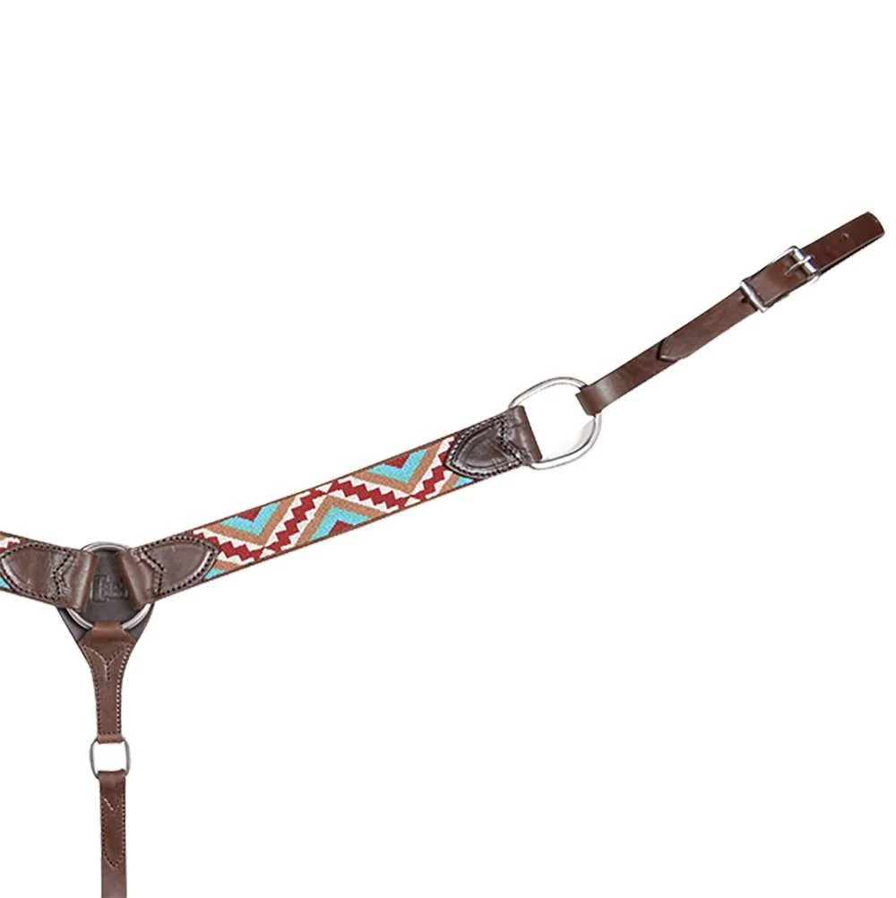 The Cashel Chocolate/Tan breast collar is made of chocolate skirting leather with beaded accents and 2″ wide.