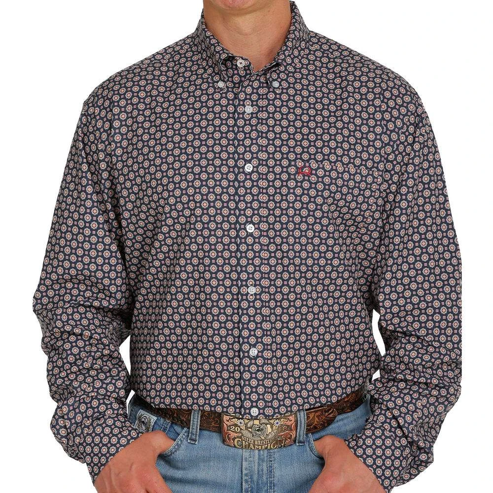 Stylish and comfortable with the perfect amount of stretch, this navy medallion printed Arenaflex shirt will keep you looking sharp in and out of the saddle. Design details include an open left front pocket, embroidered CINCH logo and white buttons.