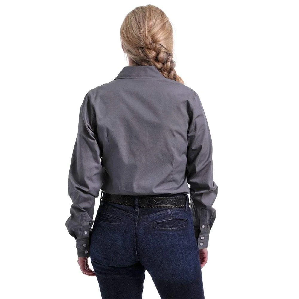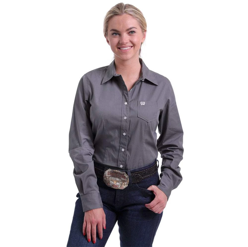 This Cinch women’s button-up shirt is made with a solid cotton plain weave, has white logo buttons and a necktape making it a classy shirt for the arena!
