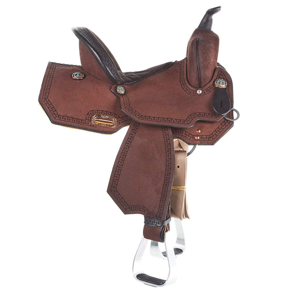 Experience the excellence of High Horse by Circle Y with the Lindale 13 Inch Roughout Barrel Saddle. This saddle is crafted to perfection, combining quality and affordability. It features a wide tree made of High Horse DURAhide, ensuring durability and longevity. The 5″ Cheyenne cantle provides stability and support during barrel racing. With a 12″ swell width, this saddle offers a comfortable fit for both horse and rider. The 3″ tall horn with a 2 1/4″ cap allows for a secure grip. The chocolate roughout leather adds a touch of elegance, while the Meander tooled border showcases intricate craftsmanship. A turquoise copper Thunderbird concho enhances the saddle’s overall appeal. The padded chocolate suede seat with turquoise stitching offers optimal comfort for extended rides. The lightweight aluminum barrel stirrups combine strength and functionality. Weighing 25 lbs, this saddle is lightweight and easy to handle. The 7/8″ in-skirt C rigging ensures a secure fit and stability. Embrace the Lindale Barrel Saddle, known for its popularity and affordability, making it one of the top-selling choices in the market. Experience the extraordinary SP6228-730C-05-1 model, designed to exceed your expectations.