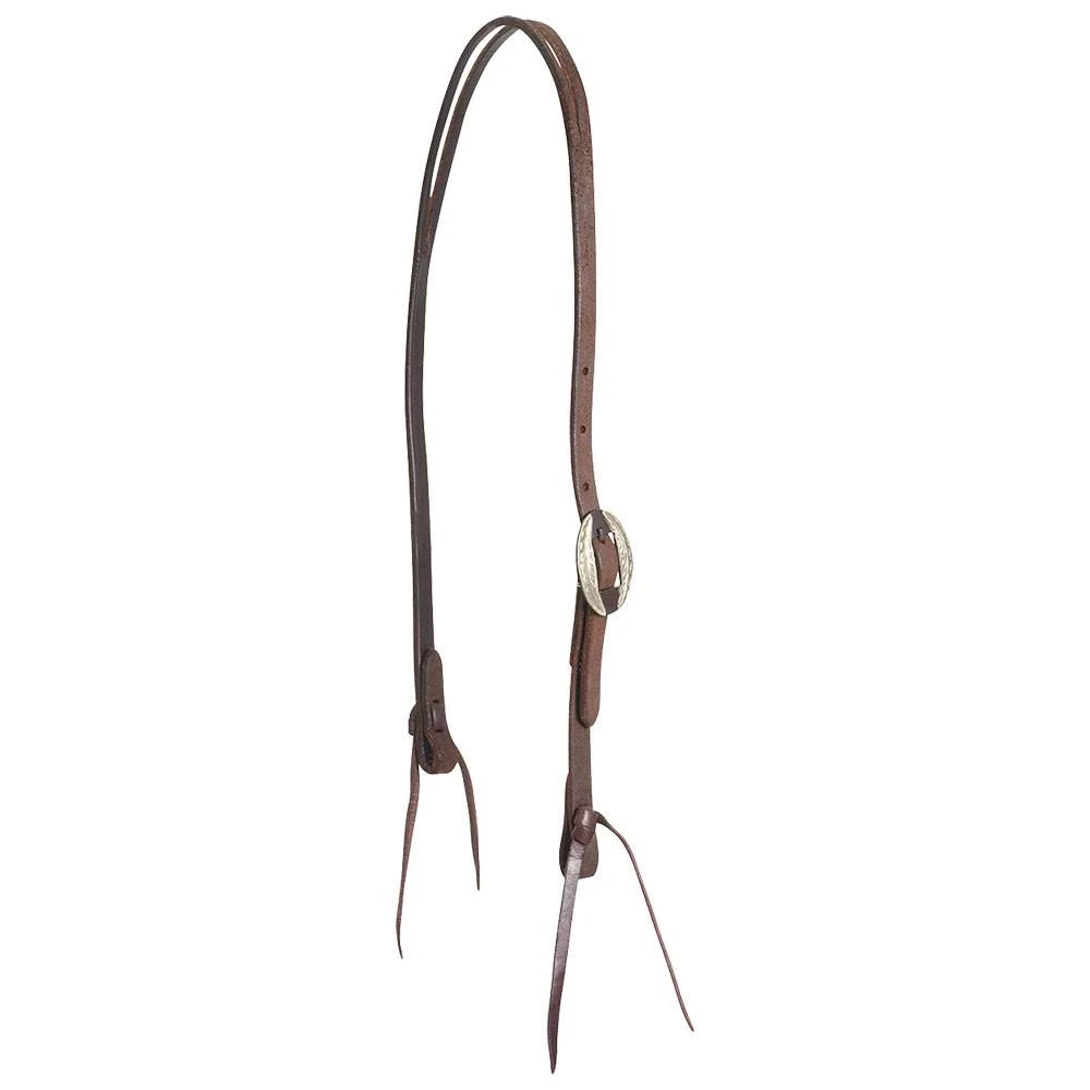 This Martin Saddlery split ear headstall is constructed of chocolate roughout leather and features buckles engraved with the Santa Rosa design.