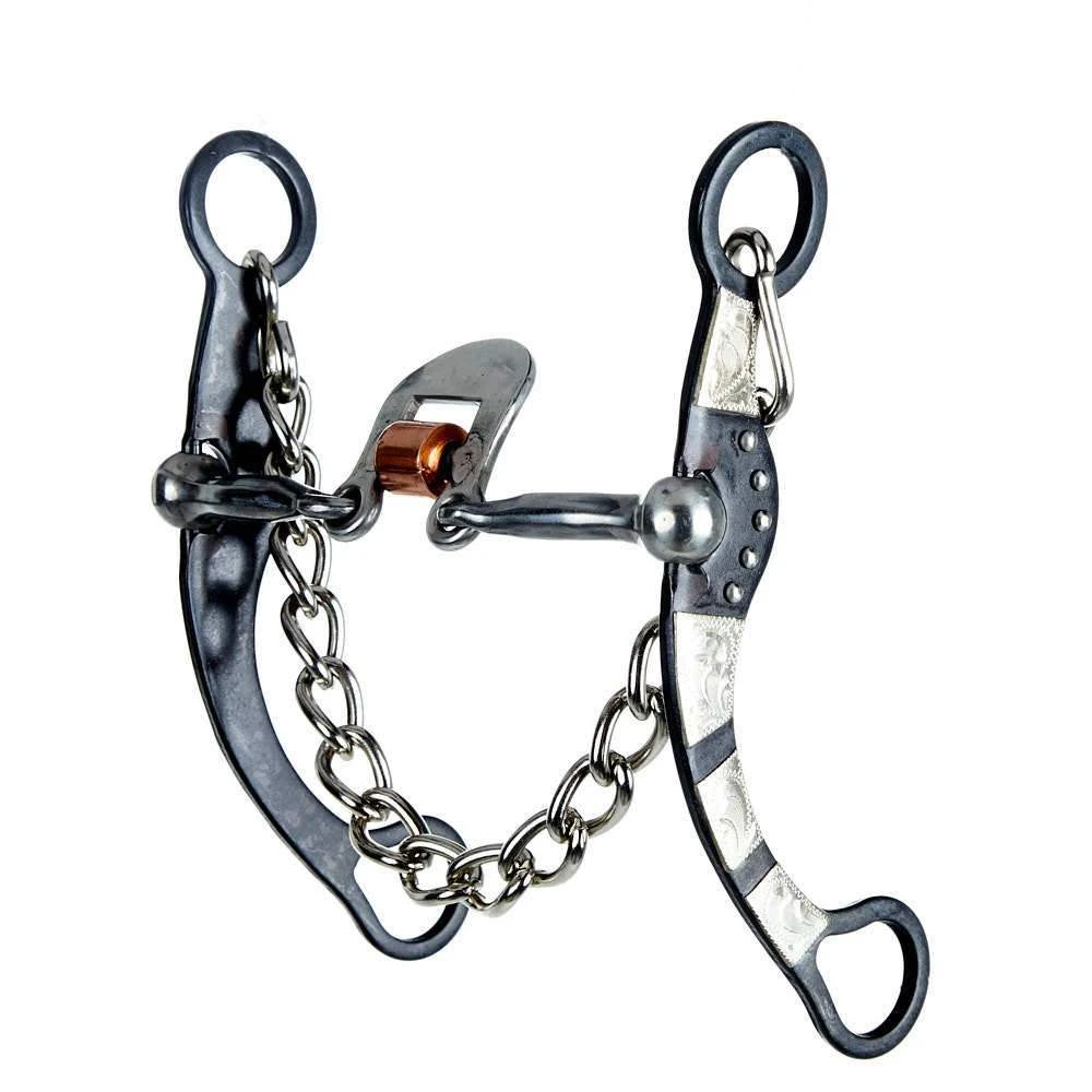 This NRS bit features a 5 inch thumb port mouthpiece with a copper cricket and 7-1/2 inch cheeks with a classic Mounted German Silver bars and dots design.Â
