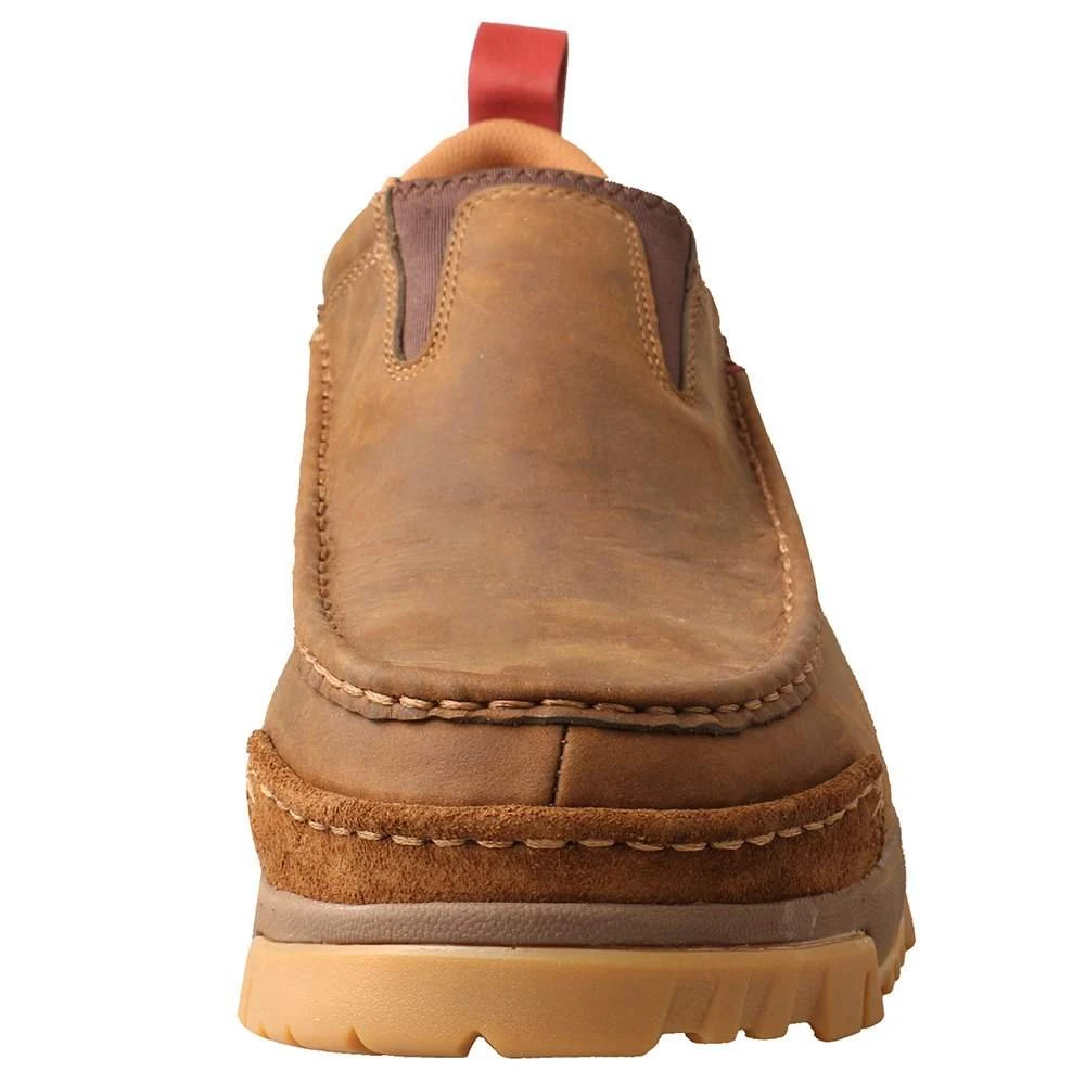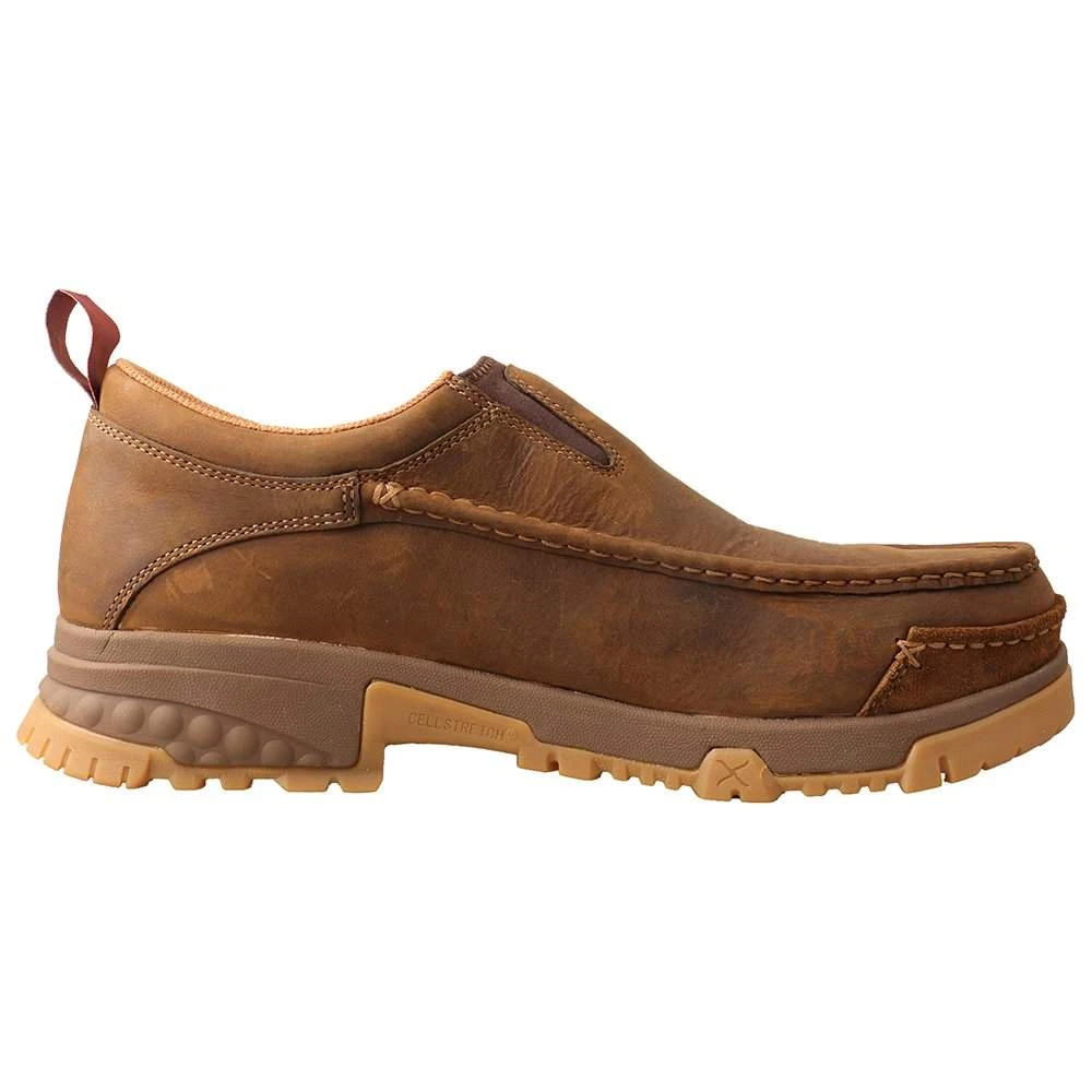 The Men’s Work Composite Toe Slip-On in durable full-grain oiled leather features Twisted X’s patented CellStretch® comfort technology, ensuring that every step you take is backed by superior comfort. The lightweight composite safety toe featured in this style provides protection that meets or exceeds ANSI standards ASTM F2413-18 M/I/C MT EH. The work slip-on moc has double gore panels that flex for ease of sliding on yet conform comfortably to the foot without the need for laces. For stability and durability, we’ve combined a compression-molded EVA midsole with the integrated CellStretch® tech and a nylon/glass fiber shank. We’ve even enhanced the outsole to provide additional slip resistance in both water and oil. Twisted X® Work footwear provides all the comfort, stability, and durability that you need to outperform any demanding work environment.