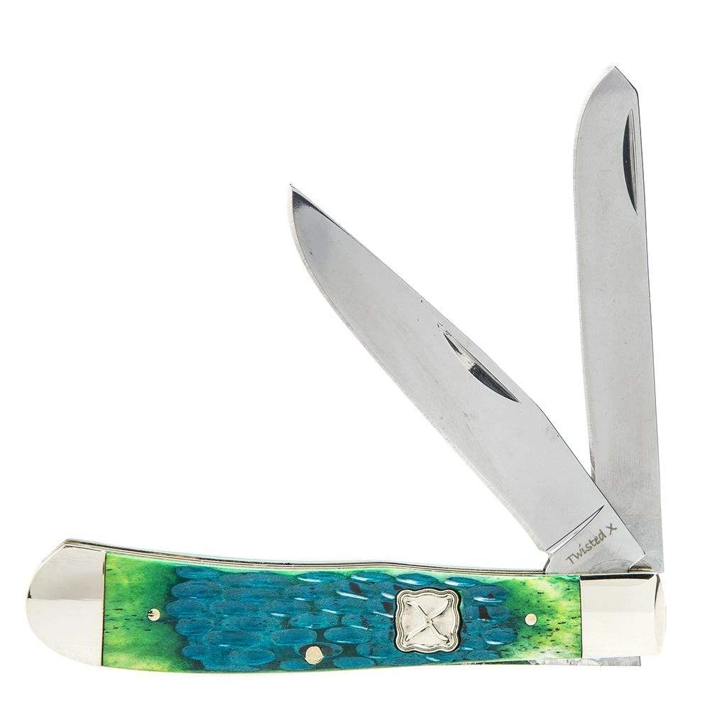 This Twisted X Trapper Knife is made with stainless steel blades and has a green and turquoise bone handle.