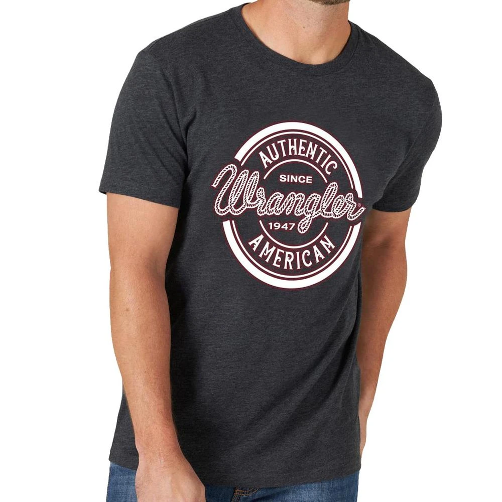 Few things are as American as Wrangler® denim. With the tried-and-true look of a crewneck tee and the lived-in feel of an old favorite, this short-sleeve t-shirt will become your go-to for casual occasions. It comes with the Wrangler rope logo you know and love along with a screen-printed design honoring 75 years of American authenticity. Plus, it’s made of a cotton blend you can wear all year long. This shirt will go perfectly with your favorite Wrangler jeans.